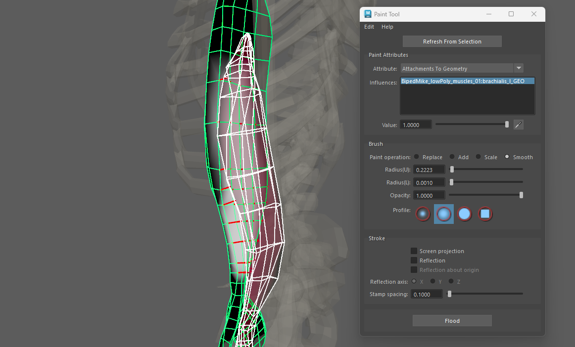 In order to provide more artistic control, some key parameters of the muscle solver are exposed as paintable attributes in the deformer. The AdonisFX Paint Tool must be used to paint those parameters to ensure that the values satisfy the solver requirements.